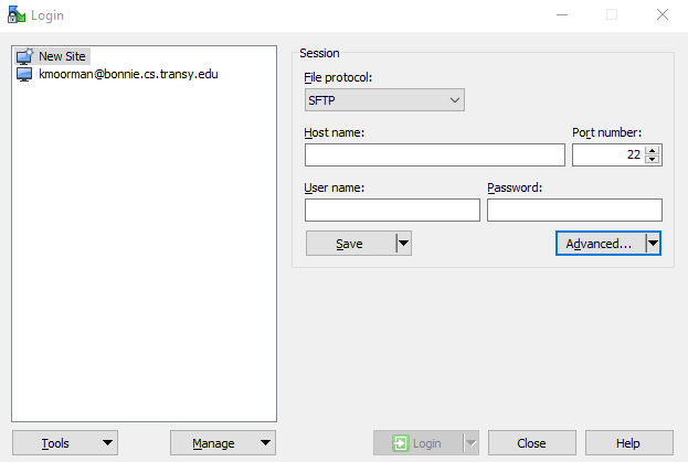 To transfer files, you will launch WinSCP. You will specify a machine and login credentials as seen in the picture below: